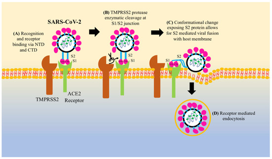 SARS-CoV-2 mechanism of entry into the host cell. SARS-CoV-2 is enveloped with a helical nucleocapsid. The envelope is coated by spike proteins, including an S1 and S2 subunit. (A) The S1 subunit has an N-terminal binding domain and a C-terminal binding domain which help with receptor binding and recognition. (B) Once S1 binds to an ACE2 receptor, it undergoes a conformational change with the help of the protease transmembrane protease serine 2 (TMPRSS2) to expose S2. (C) S2 serves as a viral fusion protein that integrates the viral membrane into the host cell membrane. (D) Once fused, SARS-CoV-2 can enter the cell via receptor mediated endocytosis.