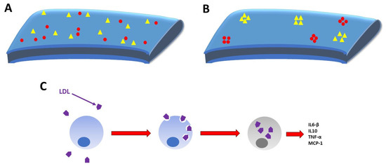The aforementioned SARS-CoV-2-associated cytokine storm involves the overproduction of cytokines which include but are not limited to Interleukins 1 (IL-1), 6 (IL-6), and 10 (IL-10), tumor necrosis factor alpha (TNF-α), and monocyte chemoattractant protein 1 (MCP1) [51,52,53]. LDL, by exposure to endothelial oxidative agents such as enzymes, metal ions, and Peroxynitrous acid (a product of nitric oxide and superoxide anion reactions), can undergo oxidation [54]. Oxidized LDL (Ox-LDL) is associated with increased circulating levels of TNF-α, a pertinent component of the cytokine storm [55]. Ox-LDL is promptly taken up by macrophages which transition into foam cells upon intracellular accumulation of the lipoprotein (Figure 3). This intracellular cholesterol enhances expression of TNF-α and IL-6-β in foam cells (Figure 3) [56]. LDL also induces the release of IL-1, IL-6, IL-10, and MCP1 in cultured monocytes (Figure 3) [57]. Increased production of these SARS-CoV-2-relevant cytokines are associated with greater levels of LDL and could potentially render one more susceptible to the deadly cytokine storm seen in SARS-CoV-2 infection.