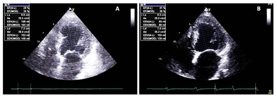 The four chambers viewed at baseline (A) and at 18-month follow-up (B). Note the reverse remodelling of the left ventricle with an increase in systolic function of the left ventricle (LVEF 41% using the Simpson biplane method).