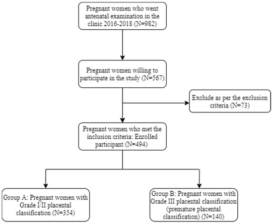 The prospective cohort study was performed between October 2017 to September 2019 after taking approval from the Institutional ethical committee of the hospital with EC registration number KIMS/KIIT/IEC/38/2017 dated 13 June 2017. After taking written informed consent, all antenatal women attending our OPD (Outpatient Department) were included in the study. The participants were enrolled (N = 494), and transabdominal sonographies were conducted between 28–36 weeks of gestation to document placental maturity. We compared maternal and fetal outcomes between patients identified with grade III placental calcification (n = 140) and those without grade III placental calcification (n = 354). Figure 1 shows the flowchart of the selection of participants for our study.