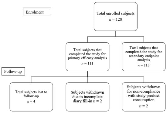 A total of 120 infants were recruited, amongst which 53 (44.2%) were female and 67 (55.8%) were male. A total of 112 infants were included in the analysis data set (Figure 1). Eight infants were excluded from primary endpoint analysis due to loss to follow-up (n = 4), prescribed antibiotics (n = 1) and un-filled daily diaries (n = 3). The mean age of all enrolled infants was 56.9 ± 34.2 days. The mean birth weight and body length was 2.8 ± 0.4 kg and 53.0 ± 5.5 cm. The head circumference average was 36.6 ± 2.9 cm.