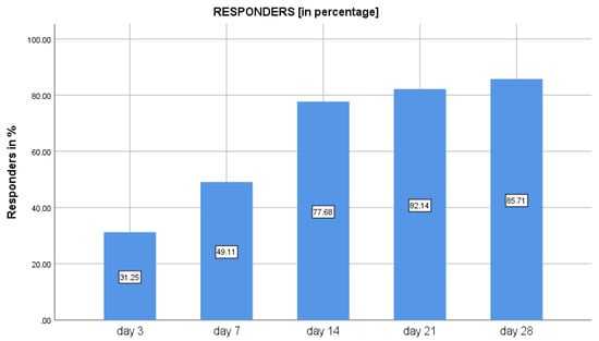 At baseline, the mean crying time was 248.2 ± 101.2 min, which reduced to 171.5 ± 91.2 min on day 3, representing a 25% decrease from the baseline. The reduction in crying time from baseline to day 7, 14, and 21 was 41%, 60%, and 72%, respectively. The decrease in crying time was maintained post-therapy from day 21 to day 28, being 45.7 ± 79.1 min on day 28 (P < 0.01). The overall percentage reduction of crying time between day 0 and day 28 was 78.9% (Table 1). The percentages of responders with 50% reduction in crying time compared to baseline were 31.3% (n = 35) on day 3, 49% (n = 55) on day 7, 77% (n = 87) on day 14, 82% (n = 92) on day 21, and 85% (n = 96) on day 28 (Figure 2).