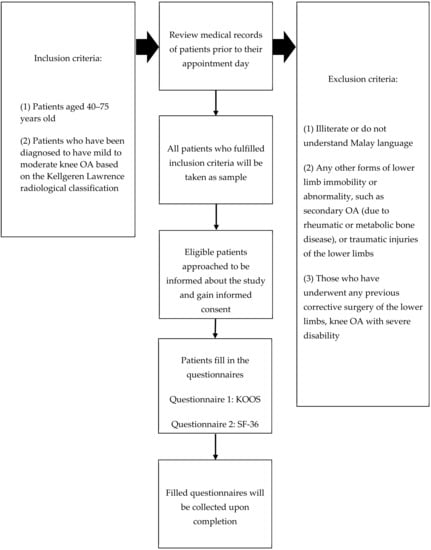 Patients were selected according to the inclusion and exclusion criteria. The inclusion criteria were: (a) aged between 40 and 75 years old, and (b) diagnosed to have mild and moderate knee OA based on the Kellgren–Lawrence (K–L) radiological classification, in which K–L 1–2: Mild, and K–L 3: Moderate []. The exclusion criteria were: (a) illiterate and does not understand Malay language, (b) any other forms of lower-limb abnormality such as secondary OA (due to rheumatic or metabolic bone disease) or traumatic injuries, (c) any previous corrective surgery of the lower limbs, and (d) knee OA with severe disability (defined as handicap or needing full assistance in all activities of daily living and social roles).