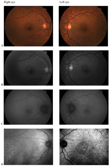 (A) Color fundus photography; (B) red-free fundus photography; (C) fundus autofluorescence; (D) Scanning laser ophthalmoscopy (SLO) fundus image revealed abnormal macular reflectivity in the left eye.