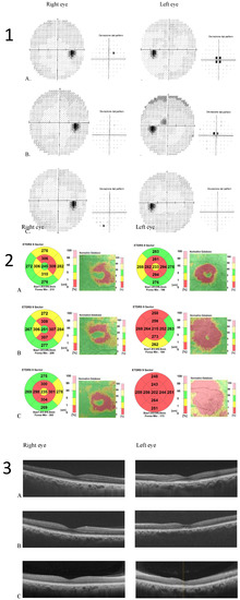 (1) Humphrey visual field 30–2 map and total deviation map (A). baseline; (B) 6 months after Tacrolimus discontinuation; (C) 3 years after Tacrolimus discontinuation. Progressive resolution of the left eye central scotoma is evident; (2) Optical coherence tomography (OCT) Thickness Maps (A) baseline, (B) 6 months after Tacrolimus discontinuation, (C) 3 years after Tacrolimus discontinuation. Macular thickness progressively reduced in the left eye more than in the right eye; (3) OCT retinal segmentation analysis of both eyes (A) baseline, (B) 6 months after Tacrolimus discontinuation, (C) 3 years after Tacrolimus discontinuation. The retina layers are preserved in the right eye and thinning of the outer nuclear layer is evident in the left eye.