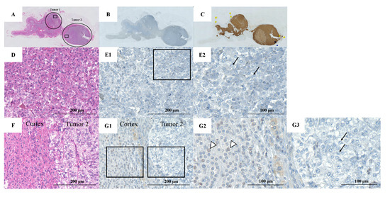 Pathological findings of left adrenal tumors resected from the patient. (A) Hematoxylin-eosin (HE) staining of the left adrenal gland (circles show the location of the two tumors); (B) MAX staining of the left adrenal gland; (C) Chromogranin A staining of the left adrenal gland; (D) Hematoxylin and eosin staining of tumor 1 (rectangular area in the tumor 1); (E1) MAX staining in tumor 1 (rectangular area in the tumor 1); (E2) Rectangular area in panel E1. Pheochromocytoma (PCC) cells in the adrenal medulla show no MAX staining (arrows); (F) HE staining of tumor 2 (rectangular area in the tumor 2); (G1) MAX staining in tumor 2 (rectangular area in the tumor 2); (G2) Left rectangular area in panel G1. Adrenal cortex cells show MAX staining (arrowheads); (G3) Right rectangular area in panel G1. The PCC cells show no MAX staining (arrows).