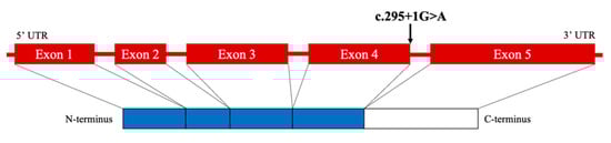 The peripheral blood sample of our patient showed a heterozygous single nucleotide substitution in MAX (c.295 + 1G > A). The majority of MAX mutations result in truncated proteins [15]. A truncated protein was observed in the case of the same variant (c.295 + 1G > A), as reported previously [5]. In that case, the mutation site was in the intron but was located at the donor/acceptor splice site, leading to the skipping of exon 4. Therefore, we estimated that skipping exon 4 produced truncated proteins that had no ability to regulate cell proliferation, differentiation, and apoptosis and promoted the development of tumors in our case (Figure 4).