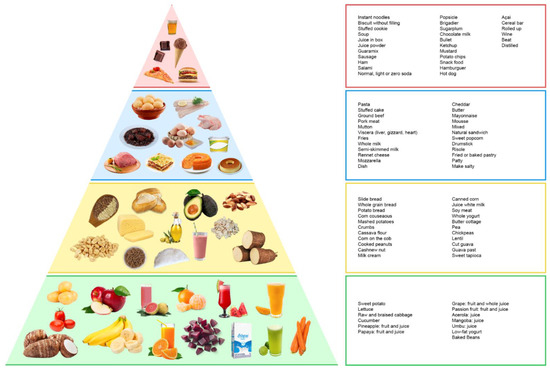The Guideline on Fat Consumption and Cardiovascular Health and the Positioning on Fat Consumption and Cardiovascular Health discuss the contribution of fats and simple carbohydrates to the genesis of CVD. According to these documents, high consumption of saturated and trans lipids is correlated with an increase in LDL-c and, consequently, with an increase in cardiovascular risk. In addition, the type of fat consumed can also influence other risk factors such as insulin resistance and increased blood pressure. As for fast-absorbing simple carbohydrates, high intake favors an imbalance between the supply of lipids and other nutrients, allowing the establishment of hypercholesterolemia, excess weight, and the development of obesity and postprandial changes such as hyperglycemia, hyperinsulinemia and hypertriglyceridemia, which are all associated with increased cardiovascular risk [51,55]. In the present study, red group foods with the highest consumption rate were candy, soup, soda, beer, cream crackers, water and salt, stuffed cookies, ice cream, ham and powdered juice.