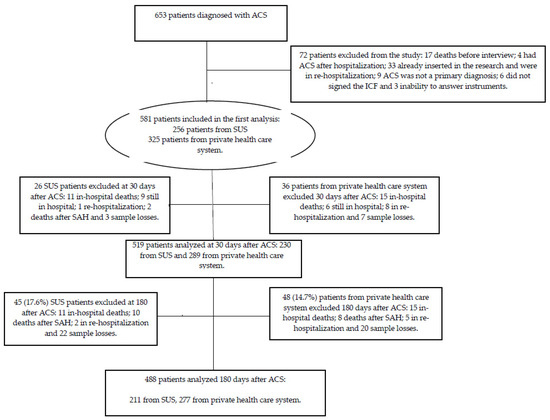 A total of 581 patients were considered potentially eligible for the study: 256 (44.1%) received medical care from public health care and 325 (55.9%) from the private one. At 30 and 180 days after ACS, we interviewed 519 and 488 patients, respectively.