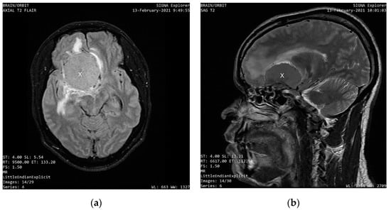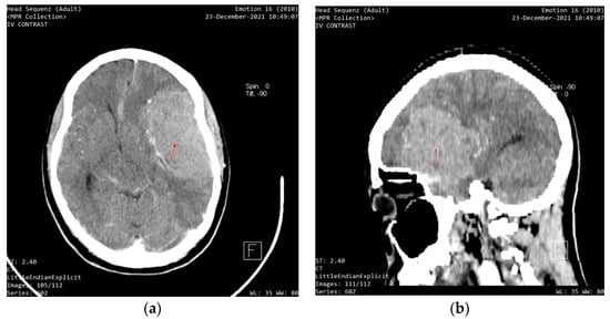 (a) An axial section showing a contrast image depicting a well-circumscribed, homogenous mass compressing the left frontal lobe; (b) A sagittal section shows a contrast image depicting an intracranial mass.