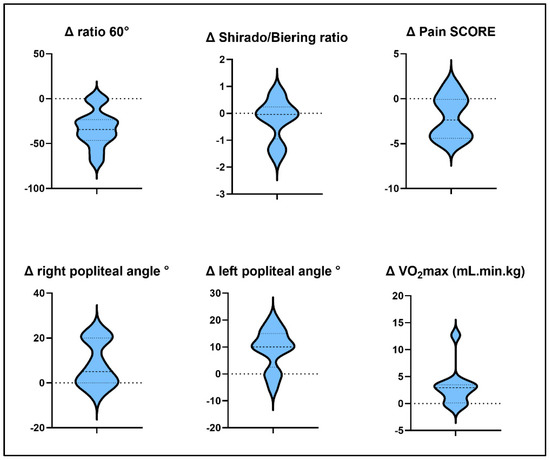 | Distance heel–buttocks Left (cm) | 9.67 ± 7.88 | 5.58 ± 4.91 | 0.0278 | 0.62 |