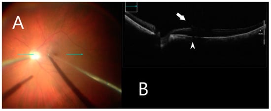 iOCT immediately after membrane peel. (A) Intraoperative surgical view after membrane peeling. Horizontal scan line (green arrow). (B) B-scan shows inner retinal hyper-reflectivity not associated with retinal hemorrhage (white arrow). Subretinal fluid accumulation is also visible (white arrowhead).