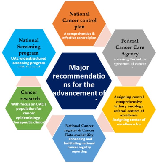 Cancer is one of the major health issues in the United Arab Emirates (UAE), leading to substantial morbidity and mortality. It accounts for 10% of all mortality in the UAE, which made it the third-leading cause of death after cardiovascular disease and injuries in 2019 []. The UAE is determined to reduce cancer mortality by nearly 18% by 2025. Reducing the number of deaths due to cancer is one of the key performance indicators of the UAE’s national agenda as a “Pillar of World-Class Healthcare” [].