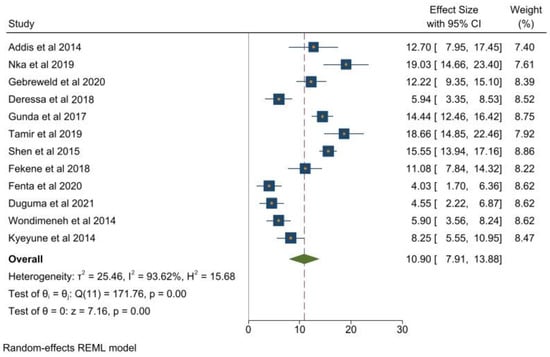 | Wondimeneh et al. 2014 [23] | 11.37 (8.24–14.49) | 93.50 | ≤0.001 |