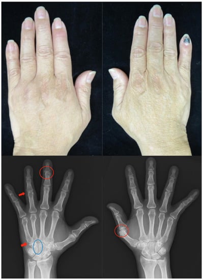 Clinical photographs and radiographs of the hands in case 6. Radiographs show bone erosion, loss of cleft space, and joint destruction in the PIP joint of the hands (red arrow). PIP, peripheral interphalangeal.