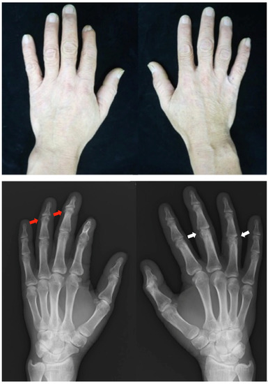 Clinical photographs and radiographs of the hands in case 3. Swan-neck deformities of the left fifth finger and both hitchhiker’s thumbs are shown. Radiographs depict joint space narrowing in the left second and fifth DIP joints (red arrow). Radiographs show subluxation of the left second MCP joints and bone erosions at the left fourth PIP and wrist joint (white arrow). MCP, metacarpophalangeal; PIP, peripheral interphalangeal; DIP, distal interphalangeal.