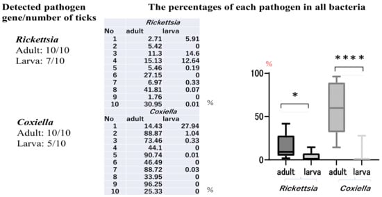 The gene detection rates in the adult ticks were 10/10 for Rickettsia sp. and 10/10 for Coxiella sp. Conversely, the detection rates for larval ticks were 7/10 for Rickettsia sp. and 5/10 for Coxiella sp. * When the percentage of Rickettsia sp., out of all pathogens detected via next-generation sequencing, was analyzed between the adult and larval stages of the ticks, a significant difference was observed at p = 0.0254. **** For Coxiella sp., a highly significant difference (p < 0.0001) was found between the adult and larval stages of the ticks.
