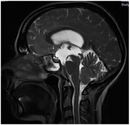 Non-steroid anti-inflammatory drugs (NSAIDs) failed to control the headaches and the response to tramadol was transient. Pharmacological treatment of her headaches with topiramate (100 mg twice daily for 3 months), propranolol (120 mg/daily for 3 months), venlafaxine (150 mg daily for 6 months, in combination with flunarizine), and flunarizine (10 mg daily for 2 months, in combination with flunarizine) proved to be ineffective. The headache did not subside or improve markedly after three classes of migraine prophylactic medications, each used for at least 3 months. The intensity of pain had not been reduced by more than 30% and contributed significantly to a poor quality of life and, as such, was classified as refractory [9]. Most responders to botulinum toxin describe their head being crushed, clamped, or stubbed by external forces, what we understand as imploding headache. We did not consider botulinum toxin injection, because the described exploding headache does not respond to this treatment [10,11]. Anti-CGRP monoclonal antibodies were not in our routine clinical practice when we were handling this case [12].