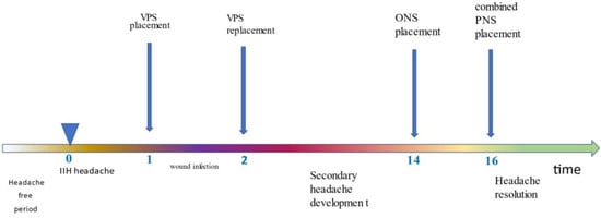Timeline of events. Time in months.IIH: idiopathic intracranial hypertension, VPS: ventriculoperitoneal shunt, ONS: occipital nerve stimulation, PNS: peripheral nerve stimulation.