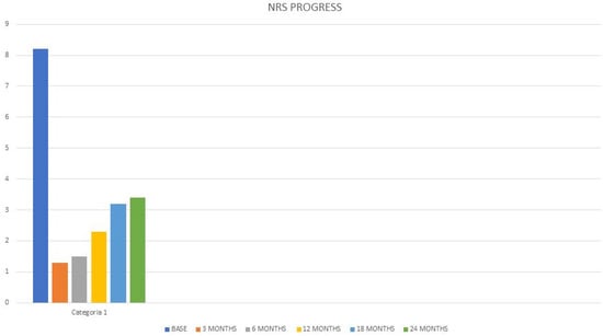 All patients were followed-up with FUs at 3, 6, 12, 18, and 24 months by evaluating the NRS and SF-12. In total, 4 patients completed the FU at 3 and 6 months. All 40 patients who underwent RFAs reported excellent pain relief at 3- and 6-months FUs (over 80% reduction in NRS) and stopped taking analgesic medications. The mean NRS value at 3 months was 1.3, at 6 months 1.5. A total of 36 (90%) patients completed FUs at 12, 18 and 24 months. At the 12-month FU, 4 (11%) of 36 patients reported good pain relief (40% to 50% reduction in NRS), while the remaining 32 (80%) patients reported excellent pain relief (over 80% reduction in NRS). The mean NRS value at 12 months was 2.3. At the 18-month FU, 10 (27.7%) of 36 patients reported good pain relief (40% to 50% reduction in NRS), while the remaining 26 (72.2%) patients reported constant excellent pain relief (over 80% reduction in NRS). The mean NRS value at 18 months was 3.2. At the 24-month FU, 17 (47.2%) of 36 patients reported good pain relief (40% to 50% reduction in NRS), while the remaining 19 (52.7%) patients reported excellent pain relief (over 80% reduction in NRS). The mean NRS value at 24 months was 3.4 (Figure 2). Patients who reported good pain relief at the 12–18- and 24-months FUs significantly reduced their analgesic medication intake by discontinuing continuous intake. All patients who reported excellent pain relief discontinued their previous pain medication completely. The mean value of the SF-12 administered before treatment was PCS 28.5, and MCS 36.9, respectively, while the mean value in the FU up to 24 months was PCS 46.7 and MCS 58.5, with an improvement in PCS of 163.9% and MCS of 158.5% (Figure 3). We also compared the NRS values of the patients before treatment and at 24 months which showed a 1-tailed t-value of −18.71 with statistical significance with a p-value < 0.05. Patients reported extreme satisfaction with the procedure performed and reported a significant improvement in their quality of life. Furthermore, they reported that they would repeat the procedure in case of recurrence of pain symptoms. No adverse events occurred.