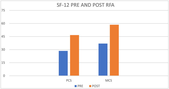 SF-12 Pre and Post RFA. SF-12 questionnaire, Physical Component Score (PCS) and Mental Component Score (MCS).