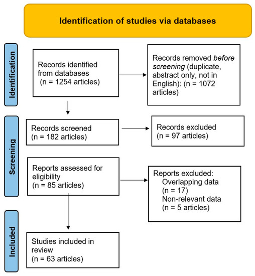 The review identified 1254 articles in the employed databases; of them, 1072 were removed before screening, Figure 1. Throughout the screening process, the remaining 182 articles were manually reviewed by GMM, and further assessed by another two authors (ANC and FM). As a consequence, the other 97 records were excluded (no full-text available in English, modified version of scar rating scale). The remaining 85 articles were reanalyzed, and after excluding another 22, the remaining 63 articles were included in this review. The GMM performed the final manual selection of the studies we analyzed.