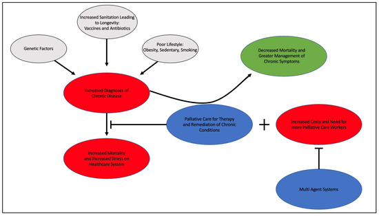 As the US struggles to treat these individual factors, the incidence of chronic disease is ever increasing. This places high demand on the healthcare system in the form of reactive rather than proactive care. When untreated, chronic illnesses progress gradually and thus individuals with chronic conditions require more long-term treatment. One such long-term treatment is palliative care, which is a branch of medicine that involves multidisciplinary care for the symptoms associated with advanced chronic illnesses. In the context of the US, palliative care is high-level care from a multidisciplinary team with efforts focused on curative ends [16]. Hospice care shares the same aspects as palliative care; however, it differs fundamentally in terms of comfort measures only because curative efforts have been largely abandoned [16]. Palliative and hospice care have been proven to improve the quality of life and medical care in end-of-life treatment [17]. With improved life expectancy and the contributing factors therein, the question of how these patients suffering from chronic illness will be cared for is of increasing import. The current medical system allots over 80% of its expenses to chronic disease treatment per year [18]. Despite the magnitude of the expenditures devoted to the treatment of chronic illness, data projects that the prevalence of chronic illness will continue to increase [5]. Therefore, the need for a new medical system, or one bolstered with a more powerful synergistic factor, is of great necessity in order to combat this growing epidemic. A potential candidate for this position may be the Multi-Agent System (MAS). With MASs, a system of agents can make predictions on the steps needed to improve the patient’s health and can be updated in real time at a central location, and thus may allow for an additional layer of synergism to be added to the healthcare schema [4]. The use of this system could greatly expand and make efficient the resources that are already present, mitigating the increased costs of instituting palliative care as a healthcare standard in the treatment of chronic disease.