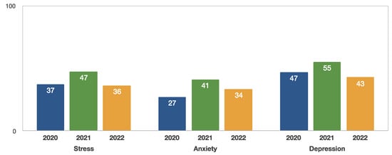 The three-year analysis revealed similar demographic characteristics and correlations. During the third-year analysis, previous psychological or psychiatric treatment was reported as increased during November 2022 in comparison to the first year of the pandemic (November 2020) [4]. An extremely severe prevalence of stress, anxiety and depression was observed during the second year of the pandemic (November 2021), with less than half of the students to be classified in the normal range of stress (40.7%), anxiety (44.4%) and depression (34.6%) [4]. In the present study, the evaluation during November 2022 presented a decline in the extremely severe levels (Table 2). Moderate to extremely severe prevalence among students was chronologically identified as follows: