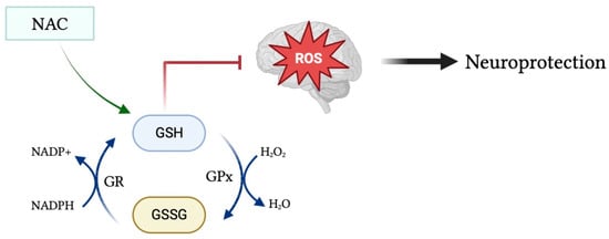 Glutathione in its oxidized form (GSSG) is converted into its reduced form (GSH) during antioxidant conditions via NADPH-dependent GR. GSH acts as a powerful antioxidant to remove harmful reactive species from the brain and protect the brain from toxic oxidative effects. Moreover, administration of the glutathione precursor NAC may upregulate GSH levels and, in turn, increase its antioxidant and neuroprotective effects.