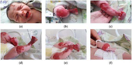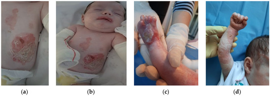 The first clinical evaluation of the newborn revealed extensive areas of denudation, skin fragility and erosions. Blister formation on the frontal region of the face was observed, as well as denudation areas and periorificial involvement. The lower and upper limbs presented significant areas of denudation, multiple superficial erosions, and haemorrhagic blisters, as well as skin fragility. The clinical presentation of the lower limbs suggested Bart syndrome. The skin surrounding the lesions was erythematous and fragile. Nail dystrophy and nail absence were observed. No other anomalies were recorded (Figure 1a–f).