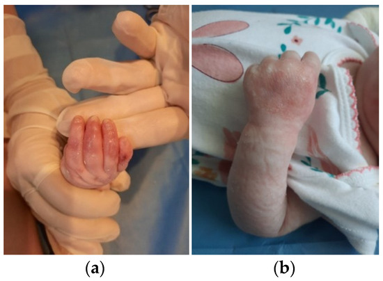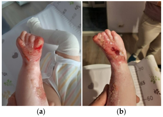 The patient was discharged after 41 days of hospitalization. Long-term follow-up of the baby revealed the appearance of new lesions and vicious cicatrization of the previous ones, leading to syndactyly at the age of 8 months (Figure 2a–d, Figure 3a,b and Figure 4a,b).