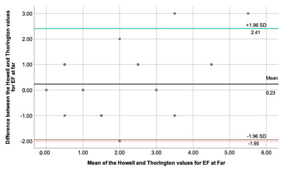 On the contrary, the Thorington and Howell tests are more subjective techniques, where the verbal collaboration of the patient is essential. The patient needs to give a verbal answer about what his visual system sees. Even though the sample was carefully used to have a good understanding and the tests are easy to administer, this aspect should always be considered during the exam evaluation. An interesting observation when paring the techniques to build the Bland–Altman plot is that less difference (however statistically significant) was found for the magnitude of XF at far measured using the Howell and Thorington test, and EF at far as measured through the alternate Cover and Thorington test. Therefore, a tendency was found for the EF and XF at far using the Howell and Thorington tests, and a higher congruence among the three techniques for the EF at far. The above-mentioned studies have focused on the near phoria condition of participants, and the distance phoria state has not been raised in any of them, so we consider that the level of accommodation could affect these results. It is already known that the level of accommodation generated during a habitual near task is higher than at a distance, so higher differences are expected to be found to be found at near than far [24].