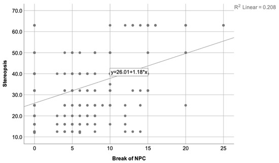 Depicts the correlation found between the stereopsis degree and the break of NPC, where = 0.208. A decreasing trend on the stereopsis degree is observed when the NPC value increases. Therefore, worse stereopsis is expected in patients with higher NPC value.