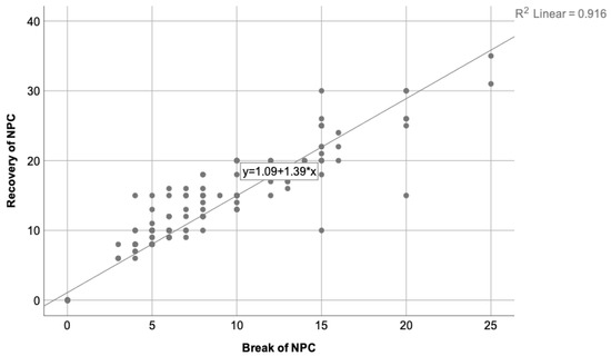 Represents the correlation state between the break and recovery of NPC, where = 0.916. As is to be expected, participants with a high break of NPC present higher recovery value as well, being that their values are proportional to each other.