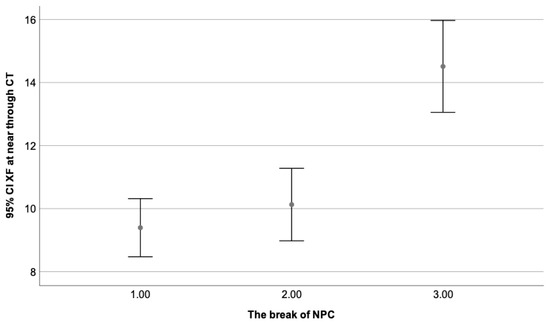A total of 181 participants presented exophoria at near and distance fixation. From the total, 91 participants (50.3%) formed the first group (break of 0–5 cm), 47 participants (26%) formed the second group (break of 6–10 cm), and 43 participants (23.7%) were included in the third group (break of 11–25 cm). Results from the One-Way Anova with Tuckey HSD for multiple comparisons analysis are illustrated in Table 6. Patients with esophoria could not be analyzed, and considering the small sample, divided into groups, could not be representative. Figure 6 represents the mean value and Std of the exophoria state at near fixation only (as presenting a stronger correlation) as a dependent variable of the break value of NPC. A higher break value (worse) is related to a higher magnitude of exophoria (worse) at distance and near fixation.