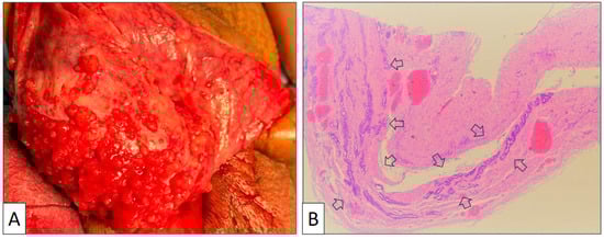 (A) Macroscopic view of the tunica vaginalis showing multiple small exophytic nodules on the surface. (B) Panoramic view of the tunica vaginalis showing glandular structures with major axis parallel to the wall and no stromal reaction or wall thickening (arrows) (original magnification, ×40).
