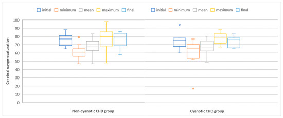 Box-plot comparing cerebral oxygen saturation measured via NIRS in non-cyanotic and cyanotic congenital heart defect groups. Abbreviations: CHD = congenital heart defect; NIRS = near-infrared spectroscopy.