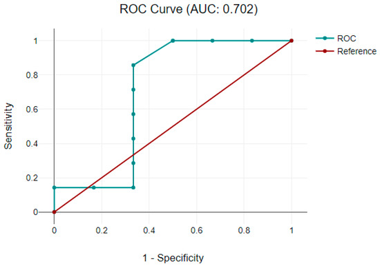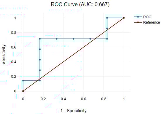 Patients with pathological neurodevelopment were considered those in which a value less than 1 was achieved at developmental scores. A receiver-operative characteristic analysis was performed to assess if postoperative neuromarkers’ levels were linked with developmental score progress and could predict a neurological impairment. A good predicting model was observed with GFAP in the cyanotic CHD group, defined by an area under the curve of 0.667 for receiver-operative characteristics, as shown in Figure 3.