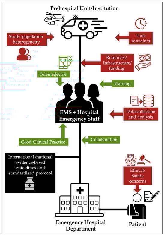 The limited resources available in prehospital care for research pose significant barriers to scientific investigations, which can result in inadequate sample sizes, incomplete data collection, and inconsistent outcomes. These challenges are primarily due to the nature of prehospital care, where medical personnel have to manage emergency situations with limited time, resources, and information []. One of the most significant challenges in conducting research in prehospital care is the limited availability of funding. Prehospital care is often underfunded and receives less attention compared to other areas of healthcare. The lack of funding means that there is a limited pool of resources available to support research in this field. As a result, many researchers struggle to access funding to support their investigations, which can lead to underpowered studies with limited generalizability []. Emergency medical services personnel are often overworked, and their primary focus is on providing immediate medical care to patients []. As a result, it can be challenging to recruit personnel to participate in research studies or to allocate time to collect data. Additionally, prehospital care infrastructure is often decentralized, with services provided by multiple organizations with different protocols and resources []. This can make it difficult to standardize data collection and analysis across different regions, leading to inconsistent outcomes. The lack of access to prehospital care data is another significant barrier to conducting research in this field []. Prehospital care data are often fragmented and dispersed across multiple agencies, making it difficult to collect, integrate, and analyze the data. There are also issues related to data privacy and security that can limit the sharing of data between agencies and organizations, further complicating the research process []. Despite these challenges, there is a growing recognition of the importance of prehospital care research in improving patient outcomes and optimizing the delivery of care.