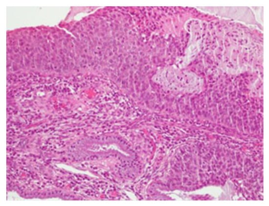 Approximately two months later, the lesion progressed, and when the patient underwent conization with a loop diathermy, the cytological abnormalities involved the full thickness of the squamous epithelium, indicating HSIL/CIN3. Conization with loop diathermy offers numerous advantages and is currently the most-used excisional technique. The therapeutic success rate ranges from 90% to 97%. The excisional treatment is indicated to allow histological examination of the removed tissue, which is necessary to identify any tumors and plan the most appropriate oncological treatment. In fact, the frequency of “occult” invasive carcinomas can reach 12% of cases, primarily consisting of stage pT1A1, pT1A2, and stage 1B tumors. It should be noted that staging for stage 1A is postoperative [].