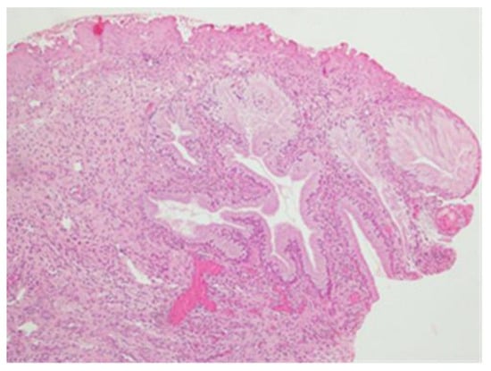 The lesion was completely removed in the small cone procedure performed on the cervical canal; therefore, in the portion of the cervix that was not removed, no histological lesion is present (Figure 6).