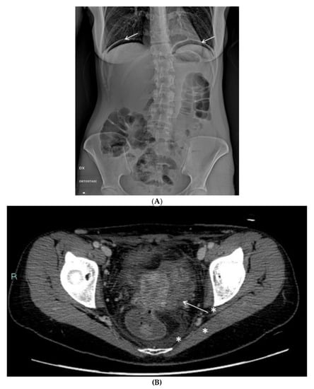 (A) Plain radiography shows free subdiaphragmatic air (white arrows). (B) Contrast-enhanced CT. A small fistula (white arrow) connects the rectum with the upper portion of the vaginal canal. Diffuse thickening of soft tissues close to the mesorectal fascia is associated with a thin fluid layer (asterisks). (C) A frame of fluoroscopy obtained through single-contrast enema performed with gastrografin. The contrast medium, injected transvaginally through a small tube (asterisk), spreads into the surrounding soft tissues (white arrows) and, to a lesser amount, into the rectum (arrowhead), confirming the presence of a pervious fistula.