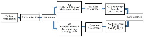 Before the selection of patients for the study, all the authors followed three practical calibration sessions regarding the precision of patients’ anamneses, clinical examination, and diagnosis; correct determination of abfraction’s degree; suitable use of the devices in conformity with the protocol (EMS Piezon, EMS Air-Flow, etc.); educational standards for adequate oral hygiene; proper application of all filling materials; the use of the same material and technique in the achievement of the thermoformed mouthguards; and the reliability of the study and acquired results. The patients selection for the study was performed by three authors, the treatment itself was performed by two other authors, and the follow-up observations were performed by the authors who were not involved in the other two stages of the study. Those who performed the direct restorations of the abfraction lesions were blinded to those who subsequently monitored the patients. The patients did not receive information regarding the location of each type of dental material applied.