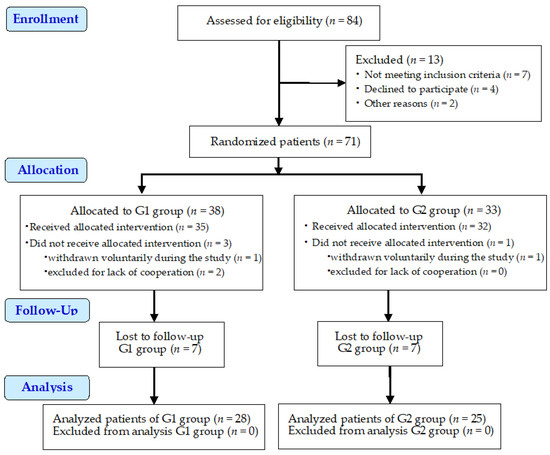 Initially, 84 subjects were assessed for eligibility, but only 71 patients were enlisted in the study. The included patients were initially divided in 2 groups of 36 and 35 patients, but after being informed of the conditions of the study, the number of patients that agreed to wear the thermoformed mouthguards (second group) was less than that of the first group of patients. Patients who did not want to wear thermoformed mouthguards, but accepted the other requirements of the study, were transferred to the first group of patients. So, the 1st group of patients (n = 38) received esthetic fillings for the abfraction lesions, and the 2nd group (n = 33) were treated with esthetic fillings and thermoformed mouthguards. Of the 1st group of patients (n = 38), 1 patient was withdrawn voluntarily during the study, and 2 patients were excluded for lack of compliance. Of the 2nd group of patients (n = 33), 1 patient was withdrawn voluntarily. During follow-up, 14 patients were lost, out of which 3 patients belonging to the 1st group and 4 belonging to the 2nd group were withdrawn voluntarily and the rest were excluded for lack of compliance.