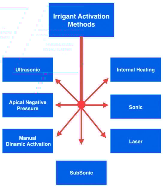 Considering the irrigant solution, sodium hypochlorite (NaOCl) is the most typically used irrigant, owing to its elevated ability in tissue dissolution and superior antimicrobial activity. Multiple procedures can be used to maximise the action and effectiveness of NaOCl [8,9]. Some techniques for activating the irrigants used during an endodontic procedure can be listed as follows (Figure 1):