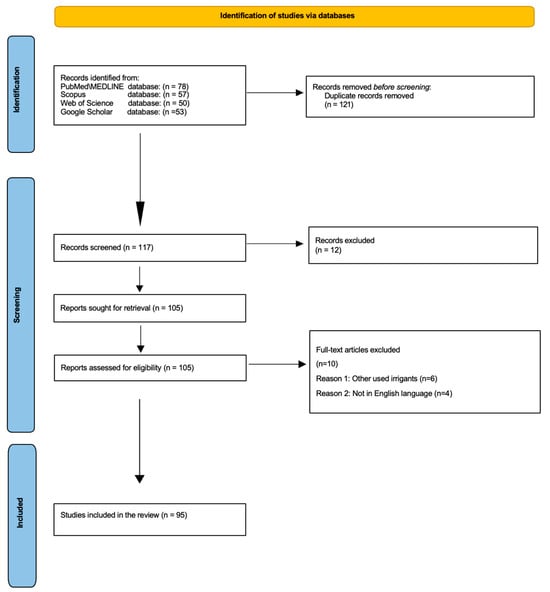 The initial electronic search identified 238 potential articles. In particular, 78 records were found using MEDLINE/PubMed, 57 were found using Scopus, 50 were found using Web of Science, and 53 were found using Google Scholar databases. Once duplicates were removed, of the 238 title abstracts identified, only 117 title abstracts were screened. Of these 117 title abstracts, 12 were removed, and 105 full-text articles were assessed for eligibility. After excluding ten full-text articles, only ninety-five were useful for the present review following the inclusion and exclusion criteria (Figure 3).