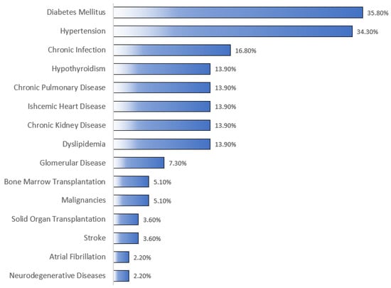 As summarized in Table 2, the most frequent indications for which RTX was used were hematological malignancies, autoimmune CTD, and benign/non-malignant hematological diseases, accounting for 42.3%, 27%, and 17.5%, respectively. More than half (56.2%; n = 77) of the patients received the 375 mg/m2 dose, with a median number of five doses/cycles (Q1, Q3: 2, 7). RTX’s mean cumulative dose was 3216 ± 2282 mg, with a median of 2625 (Table 3). Besides RTX, almost half (48.9%; n = 67) of the patients were on steroids, and less than a third (10.2%; n = 14) were on methotrexate. As shown in Figure 1, the most notable associated comorbidities were DM, HTN, chronic infection, dyslipidemia, and CKD, accounting for 35.8%, 34.3%, 16.8%, 13.9%, and 13.9%, respectively. Only a few patients had a history of bone marrow (5.1%; n = 7) or solid organ (3.6%; n = 5) transplantation. The overall mortality rate was 22.6% (n = 31), with sepsis/septic shock (45.2%; n = 14) and COVID-19 infection (16.1%; n = 5) being the most common underlying causes of mortality (Table 4).