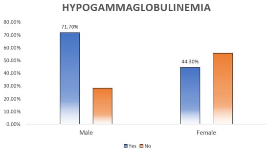 Hypogammaglobulinemia, defined as low IgG, IgM, or IgA, was diagnosed in 43.8% (n = 60) of the patients. As shown in Table 5 and Table 6, hypogammaglobulinemia was significantly more prevalent among males (p = 0.005) (Figure 2). Moreover, patients with different doses of RTX had different percentages of hypogammaglobulinemia (p = 0.012) (Figure 3).