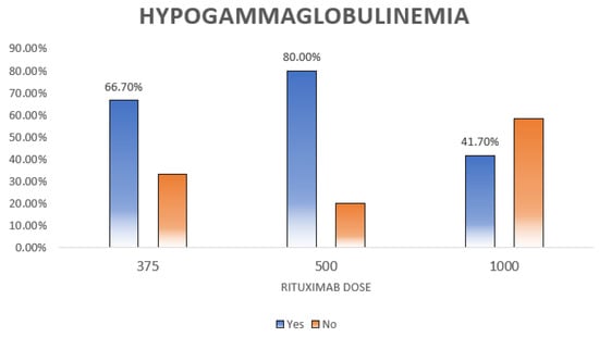 We found that different doses of RTX had significantly (p = 0.012) different rates of hypogammaglobulinemia (Table 4); however, we could not find an association between cumulative RTX dose and hypogammaglobulinemia (p = 0.307). Comparably, a study of 243 patients treated with RTX for several multi-system autoimmune diseases find no association between cumulative RTX dose and hypogammaglobulinemia [21]. Opposite to our findings, a study of 103 patients with complicated nephrotic syndrome who received at least a single dose of RTX found an association between repeated RTX cycles and hypogammaglobulinemia [49]. Next, a study of 169 patients with neuromyelitis optica who were treated with RTX reported that the mean annual RTX dose was significantly associated with hypogammaglobulinemia [44]. We believe that this discrepancy in the results is largely attributed to several factors, including the primary disease and patients’ characteristics. It is also important to mention that some of the studies have significantly linked RTX dose and infection, but not RTX dose and hypogammaglobulinemia [14,20,44,50]. We could not establish an association between the number of RTX doses and hypogammaglobulinemia (p = 0.153). Additionally, we failed to prove an association between other immunosuppressants, such as methotrexate, azathioprine, and mycophenolate, or comorbidities and hypogammaglobulinemia. Some studies have linked some immunosuppressants, such as cyclophosphamide, corticosteroids, and mitoxantrone, with the development of hypogammaglobulinemia [16,50]. It is also worth mentioning that many studies have found a significant association between particular comorbidities, such as chronic pulmonary disease, heart failure, DM, and cancer, and severe infection, but not hypogammaglobulinemia, suggesting a highly complicated interplay of multiple factors related to the patients, their pathologies, and their treatment regimens [14,20,44,50].