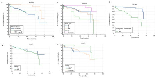Kaplan–Meier curves for overall survival analysis according to rituximab dose, blood type, the presence of hematological malignancy, steroid use, and CD19. (A) receiving the 1000 mg RTX dose was significantly associated with lower risk of mortality compared to the 375 mg/m2. (B) it appears that patients with blood type B and AB have worse survival compared to blood type A. (C) hematological malignancies significantly hinder the survival of RTX receivers. (D) the concurrent use of steroid among RTX receivers significantly hinders the survival. (E) It appears that patients with low CD19 have better survival compared to those with normal levels.